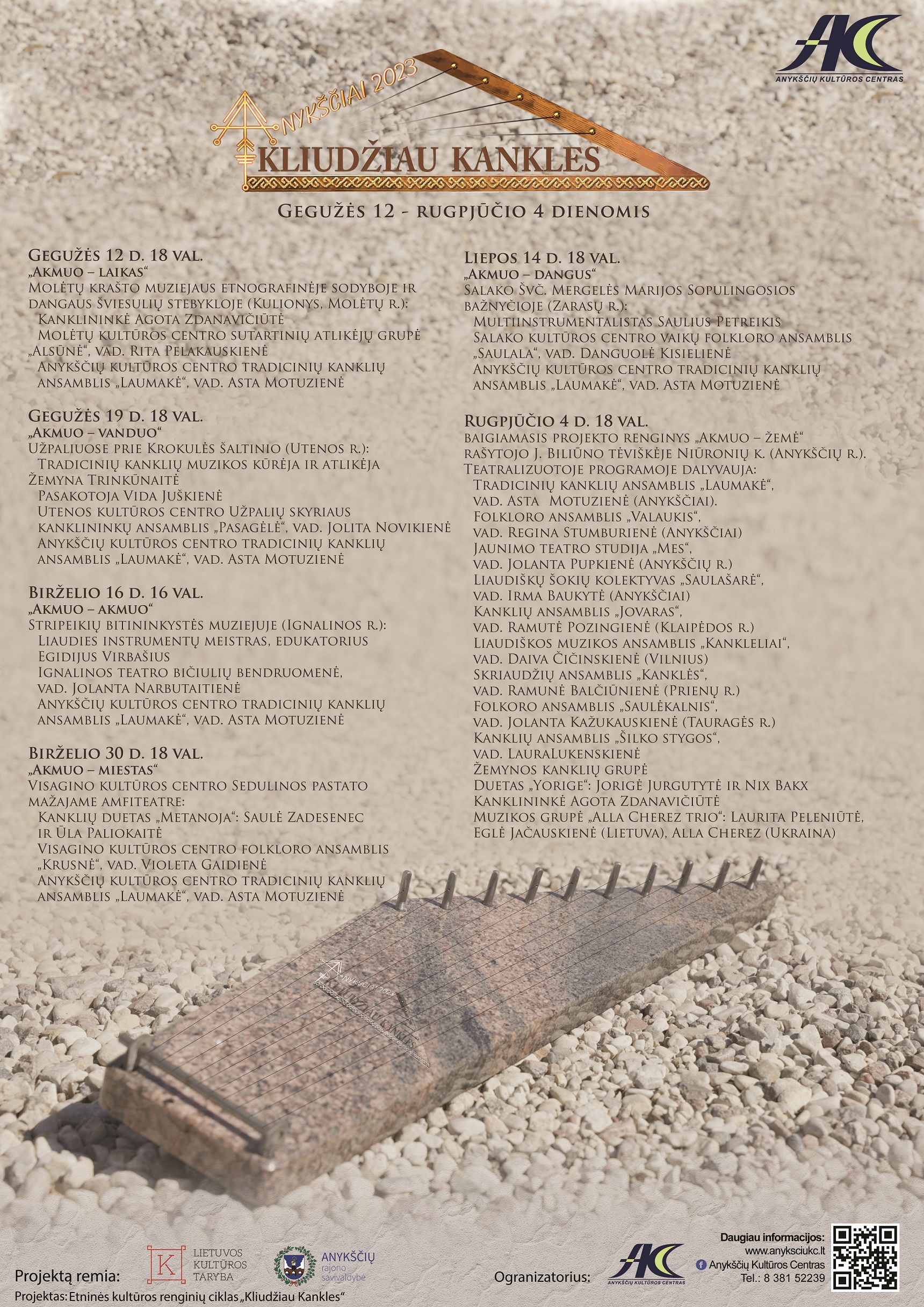 Rugpjūčio 4 d. baigiamajame projekto renginyje „Akmuo – žemė“ rašytojo J. Biliūno tėviškėje Anykščių r. Niūronių k. teatralizuotoje programoje dalyvavo ne tik Utenos regiono, bet ir visos Lietuvos tradicinių kanklių, folkloro, liaudies šokio, teatro kolektyvai bei profesionalios muzikos atlikėjai: muzikos grupė „Gausmės“: Laurita Peleniūtė, Eglė Jačauskienė, Jausmė Elena Stonkutė (Lietuva), Alla Cheres (Ukraina), kanklių ansamblis „Šilko stygos“, vad. Laura Lukenskienė (Kaunas), Žemynos kanklių grupė, duetas „Yorige“: Jorigė Jurgutytė ir Nix Bakx, kanklininkė Agota Zdanavičiūtė, Vėžaičių kultūros centro kanklių ansamblis „Jovaras“, vad. Ramutė Pozingienė, Vilniaus mokytojų namų liaudiškos muzikos ansamblis „Kankleliai“, vad. Daiva Čičinskienė, Veiverių kultūros ir laisvalaikio centro Skriaudžių ansamblis „Kanklės“, vad. Ramunė Balčiūnienė, Tauragės krašto muziejaus „Santaka“ Norkaičių tradicinių amatų ir etnokultūros centro folkloro ansamblis „Saulėkalnis“, vad. Jolanta Kažukauskienė ir Anykščių kultūros centro kolektyvai: tradicinių kanklių ansamblis „Laumakė“, vad. Asta Motuzienė, folkloro ansamblis „Valaukis“, vad. Regina Stumburienė, moterų liaudiškų šokių kolektyvas „Saulašarė“, vad. Irma Baukytė, Troškūnų jaunimo teatro studija „Mes“, vad. Jolanta Pupkienė.